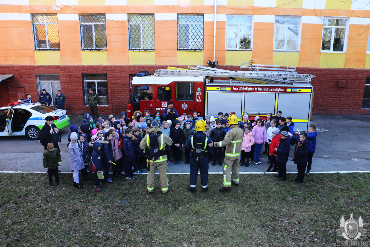 На школьном дворе огнеборцы СМВЧ-1 Тирасполя рассказали о своей профессии, показали боевую форму пожарного и специальную машину в действии, которая в числе других 4 автомобилей была безвозмездно передана МВД от Великобритании.