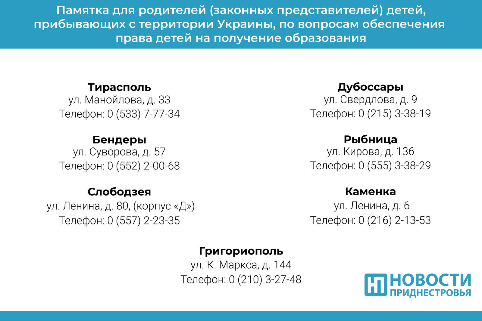 Напомним, что для приёма в организацию образования ПМР необходимо обратиться в адрес управления народного образования города (района).