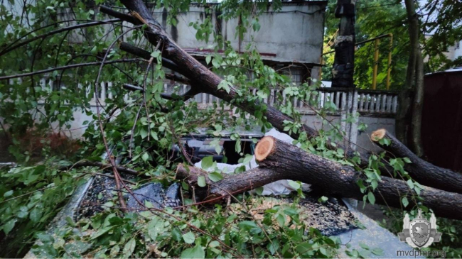 Бендеры, 12 июня. /Новости Приднестровья/. Накануне в центре Бендер по ул. Суворова на припаркованный во дворе многоэтажки автомобиль упало большое дерево, которое не выдержало порывов ветра.