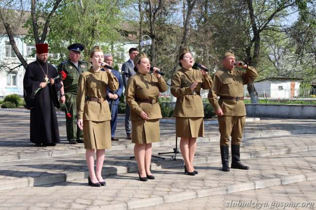 От имени молодого поколения горожан выступили учащиеся Слободзейской школы № 4. Военные песни исполнил народный вокальный ансамбль «Казачьи сердца».