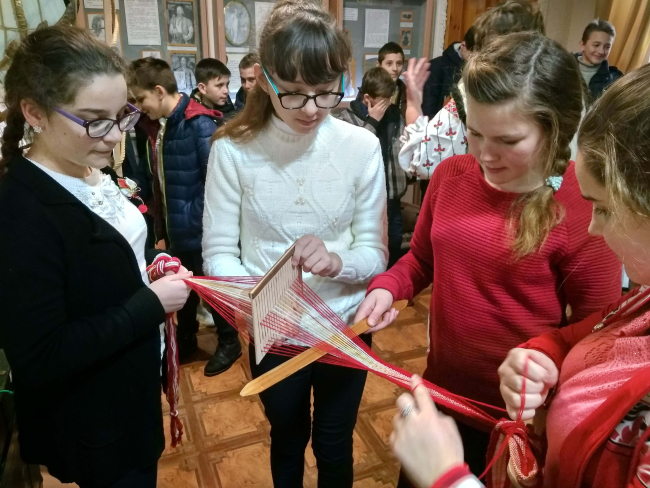 Мастер-класс по плетению на дощечках и ткачеству на берде ребятам показала преподаватель детской художественной школы Светлана Кожухарь. Учащиеся с большим энтузиазмом включились в творческую работу по плетению пояса.