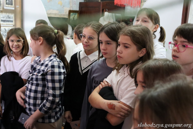 Как сообщил официальный сайт госадминистрации Слободзейского района, директор исторического музея Виктория Чебан провела для школьников экскурсию по экспозиционным залам, рассказала об истории города и района. Ребята смогли увидеть, как выглядела крестьянская изба и самая главная и красивая комната в доме молдаван – Каса маре, чем пользовались предки в своей обыденной жизни и при работе в поле. Внимание ребят привлекли подлинные предметы периода Великой Отечественной войны. Среди них гармонь, котелок и шинель. Заинтересовал фрагмент жилой комнаты советского человека и экспонаты, характеризующие советский период истории: значки, эмблемы, грамоты, школьная и пионерская форма.