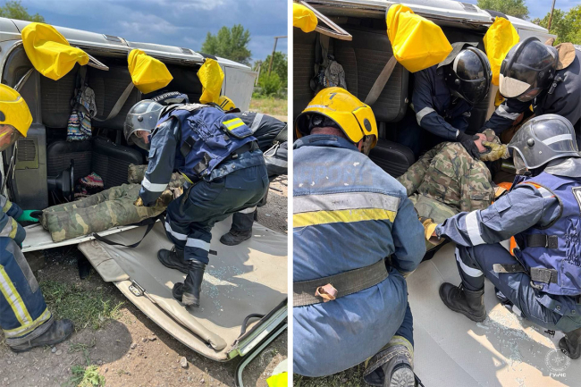 Пожарные молниеносно ликвидировали возгорание, а спасатели с помощью гидравлических ножниц буквально разрезали крышу машины, чтобы добраться до «пострадавшего».