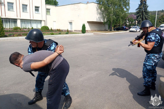 По легенде с охраняемого объекта на линию «102» дежурной части Каменского райотдела поступил тревожный сигнал. Работник госучреждения сообщил о том, что двое неизвестных с ножами и канистрой с бензином проникли на объект, чтобы захватить и поджечь здание.