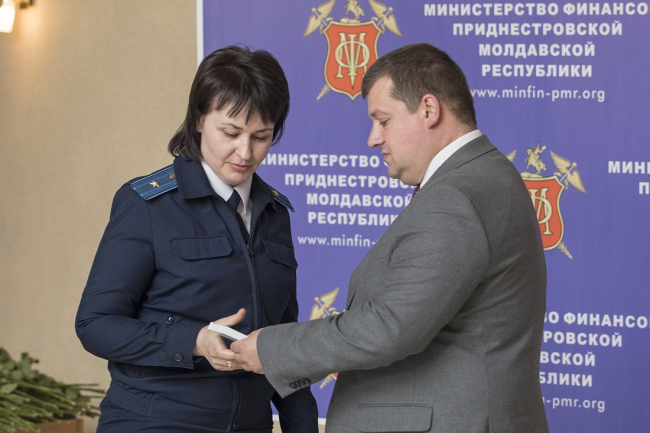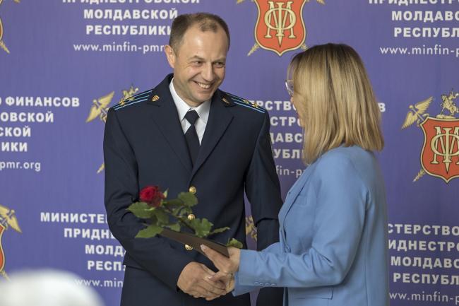 В канун профессионального праздника в Министерстве финансов прошло торжественное собрание. На церемонии присутствовали заместитель председателя Правительства Станислав Касап, депутат Верховного Совета Григорий Дьяченко, глава Союза промышленников, аграриев и предпринимателей Приднестровья Юрий Чебан.