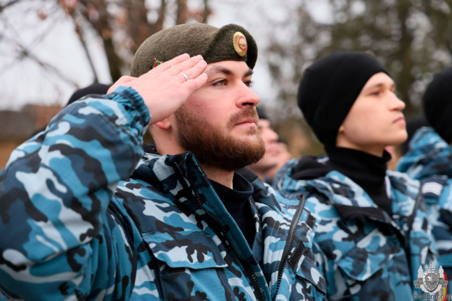 Память погибших при исполнении служебного долга почтили Минутой молчания. Цветы возложили к мемориальной доске основателю Специальной моторизованной войсковой части Михаилу Фёдоровичу Кириченко.