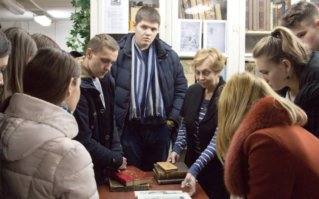 Студентам также были представлены книги на русском и иностранных языках, многие - с автографами и дарственными надписями известных учёных, писателей, общественных деятелей. Сотрудник отдела подробно рассказала слушателям о каждой из представленных книг, остановившись также на структуре и элементах книги: переплете, корешке, обрезах книжного блока, форзаце, типе бумаги. Говорилось об истории издания хранящихся в фонде библиотеки редких книг, их владельцах, содержании.