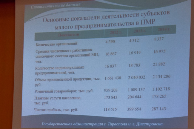 В Тирасполе вдобавок к этому предприняли шаги, призванные дополнительно стимулировать развитие предпринимательской активности. К примеру, созданный в прошлом году межведомственный совет существенно сократил сроки получения всех необходимых документов при открытии торговой точки, строительстве объекта и т.д. А совет по предпринимательству при госадминистрации стал площадкой для осуществления обратной связи предпринимателей и представителей органов местной власти.