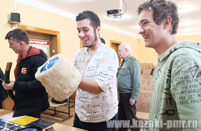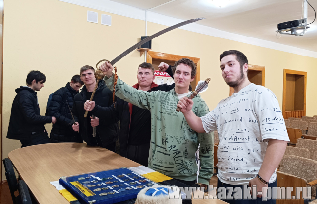 Начальник духовно-нравственного отдела ЧКВ рассказал о деятельности казачьего войска на территории ПМР и процедуре вступления в него. На память о встрече студентам подарили вымпелы, все желающие сфотографировались с казачьей атрибутикой.
