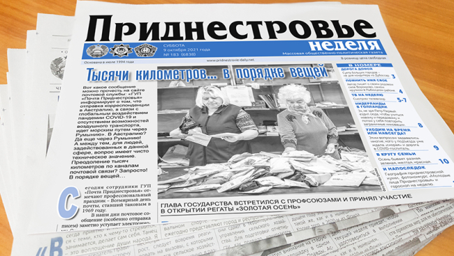 Тирасполь, 8 октября. /Новости Приднестровья/. Преодоление тысяч километров по каналам почтовой связи? Запросто! Сотрудники ГУП «Почта Приднестровья» готовятся отметить профессиональный праздник – Всемирный день почты. Отпразднуют его завтра, 9 октября. О работе приднестровских почтовиков читайте в субботнем номере газеты «Приднестровье».