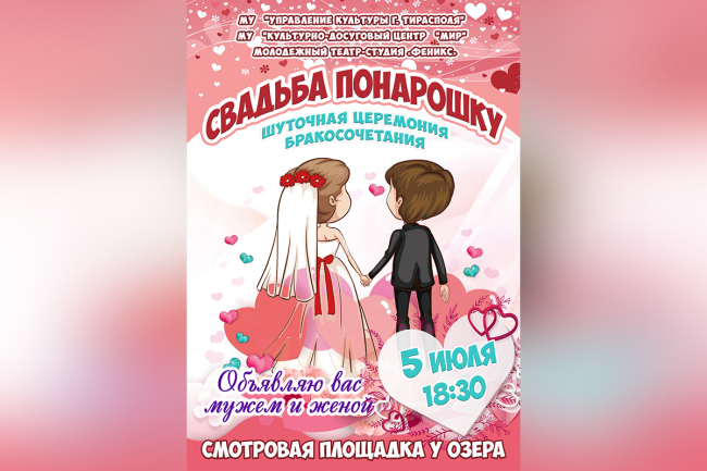 Тирасполь, 3 июля. /Новости Приднестровья/. Ко Дню семьи, любви и верности в Тирасполе столичное управление культуры совместно с Культурно-досуговым центром «Мир» и Молодёжным театром-студией «Феникс» организуют шуточную церемонию бракосочетания для всех желающих.