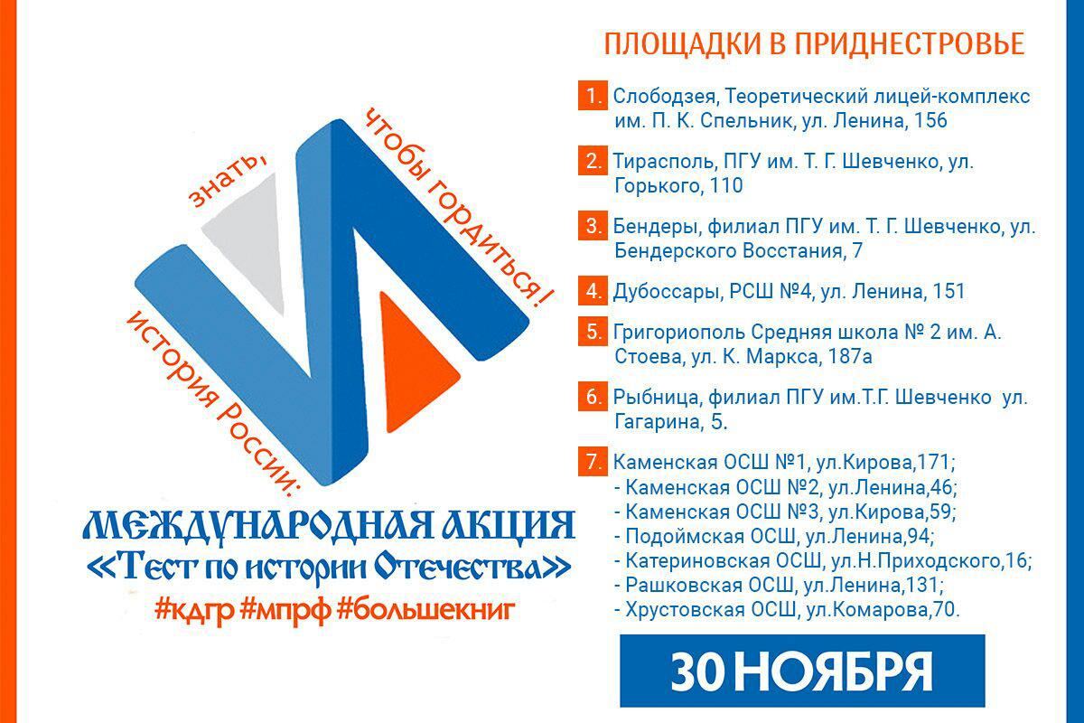 Тирасполь, 29 ноября. /Новости Приднестровья/. 30 ноября приднестровцы смогут проверить свои знания по истории России. Тестовые площадки откроются практически во всех городах республики и соберут более полутысячи школьников, студентов и работающую молодежь.