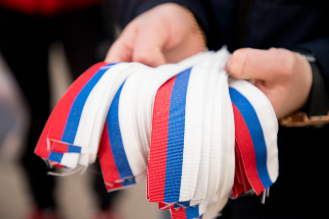 По словам заместителя председателя молодёжного движения «Звезда» Андрея Карпова, за правильные ответы на вопросы прохожим раздавали ленточки в виде российского триколора.