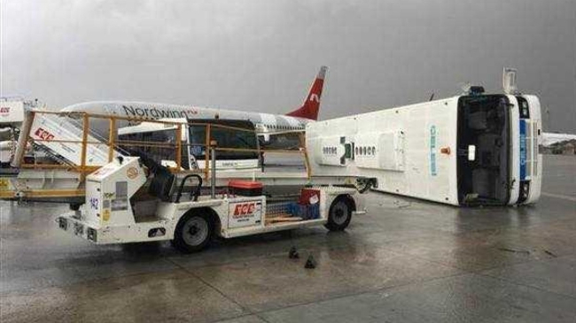 Губернатор провинции Мюнир Каралоглу сообщил, что автобус перевозил людей из здания аэропорта к самолету. Кроме этого, опрокинулся еще один микроавтобус и два трапа. Ущерб от непогоды также причинен двум самолетам и полицейскому вертолету.