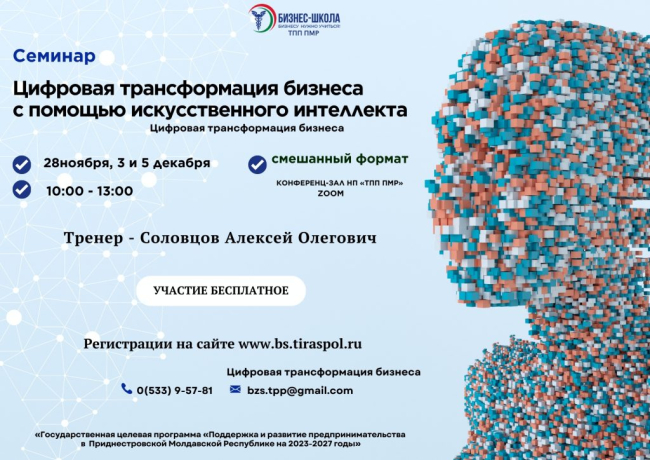 Тирасполь, 24 ноября. /Новости Приднестровья/. В Торгово-промышленной палате ПМР пройдёт семинар «Цифровая трансформация бизнеса с помощью искусственного интеллекта». Он будет трёхдневным: 28 ноября, 3 и 5 декабря.