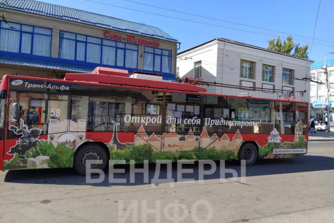Бендеры, 11 сентября. /Новости Приднестровья/. На одном из бендерских троллейбусов появились яркие наклейки с изображением Бендерской крепости, Екатерининского парка, Башни ветров и Кицканского монастыря. Их объединяет призыв «Открой для себя Приднестровье!». Сегодня это красочное транспортное средство курсирует по городу, сообщает телеграм-канал «Бендеры Инфо».