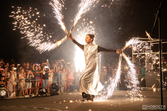 Когда начало смеркаться, на сцене у реки начался концерт вокально-инструментального ансамбля «Днестр». Популярные эстрадные мелодии звучали до тех пор, пока вокруг совсем не стемнело. И тогда музыкантов на сцене сменили участники захватывающего файер-шоу, посвящённого тридцатилетию начала миротворческой операции.