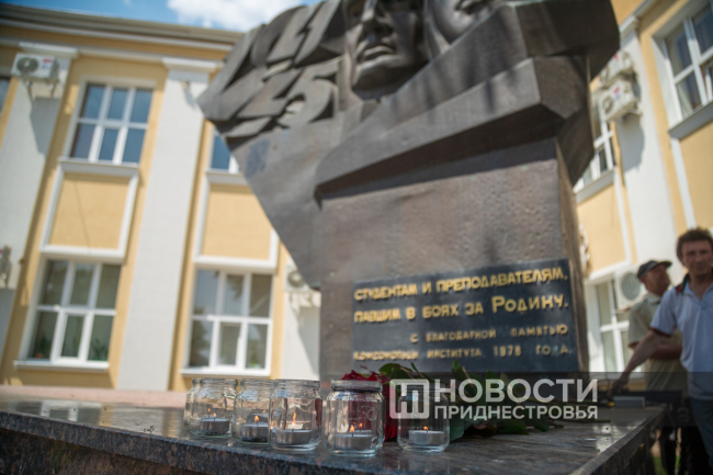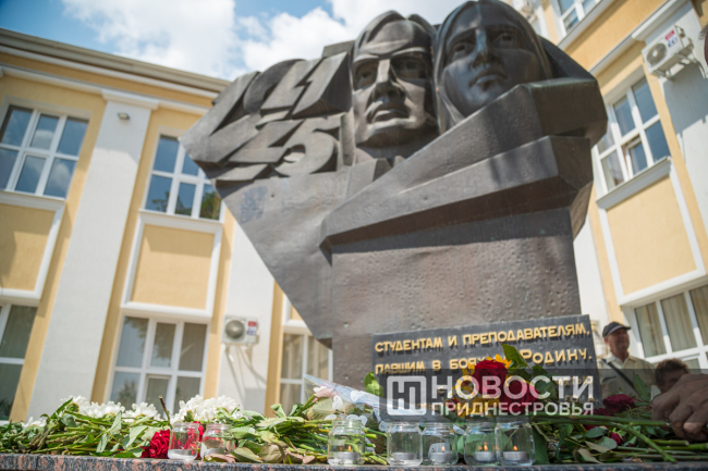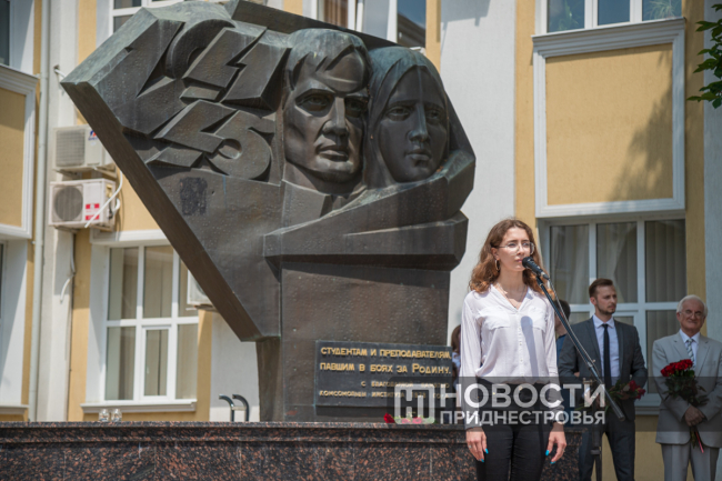 Митинг провели в Тирасполе у главного корпуса Приднестровского госуниверситета. Неподалёку от входа находится монумент, его установили здесь 45 лет назад. Это память о 30 студентах и 2 преподавателях, добровольно ушедших на фронт и погибших там.