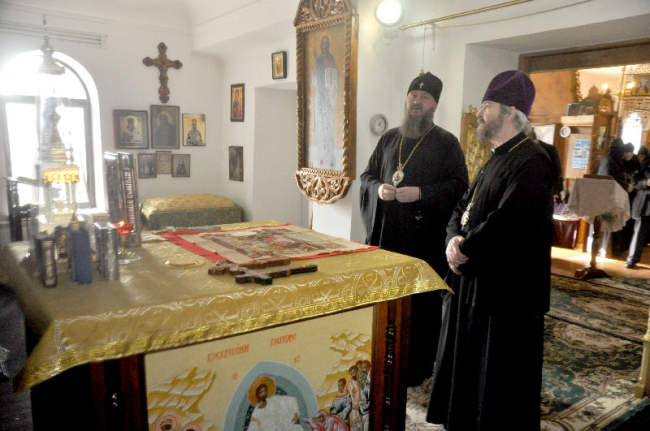 Высокопреосвященнейший Иринарх и гости епархии осмотрели внутреннее и внешнее убранство монастырского храма, поклонившись иконам и святыням, которые находятся в обители. Кроме того, Владыка Савва рассказал об истории обители, о том, как создавалась монашеская община, и проведенных работах по благоустройству монастыря.