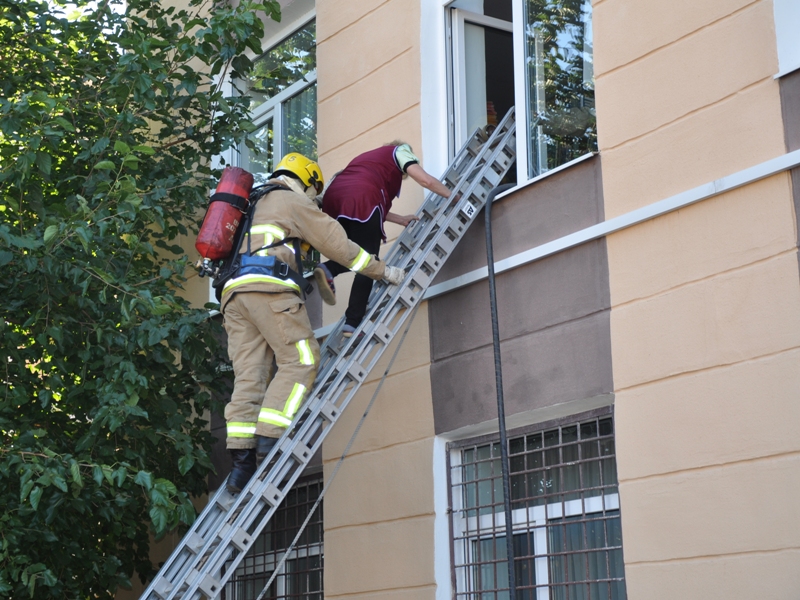 После тревожного звонка в течение нескольких минут на улицу были эвакуированы все школьники и персонал. На место происшествия приехал один пожарный расчет. Спасатели оперативно установили лестницу на подоконник окна библиотеки и забрались в помещение, где находился очаг условного пожара. Они по пожарной лестнице эвакуировали пострадавшую, после чего приступили к тушению возгорания.