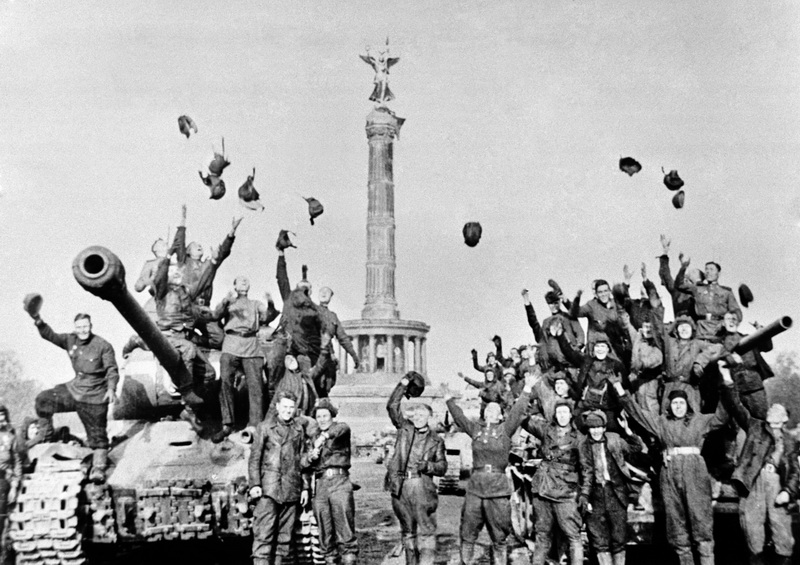 Фото фронтового корреспондента майора Марка Редькина - советские танкисты в Берлине, третий слева в нижнем ряду (поднял шлем над головой) - младший лейтенант Дмитрий Гребенников.