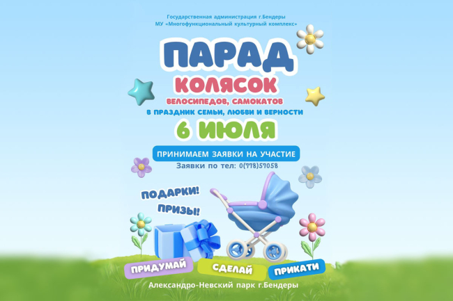 Бендеры, 26 июня. /Новости Приднестровья/. Ко Дню семьи, любви и верности в Бендерах приурочат Парад колясок, велосипедов, самокатов. Яркое мероприятие запланировано на 6 июля.