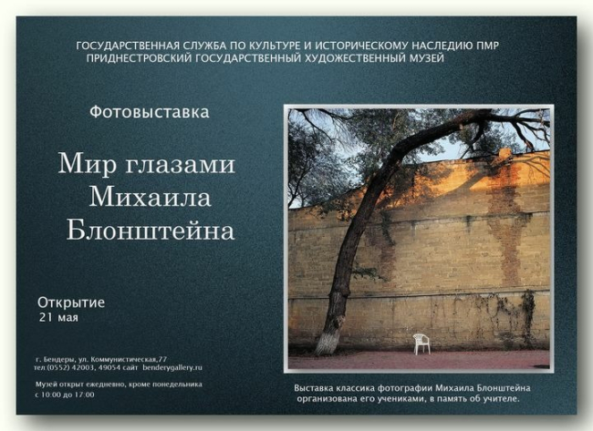 Бендеры, 19 мая. /Новости Приднестровья/. В эту пятницу, 21 мая, в 15:00 в Бендерах откроется фотовыставка «Мир глазами Михаила Блонштейна». Экспозиция будет работать в Приднестровском государственном художественном музее. Она приурочена к 70-летию выдающегося фотохудожника Приднестровья Михаила Блонштейна и открывается в его память.