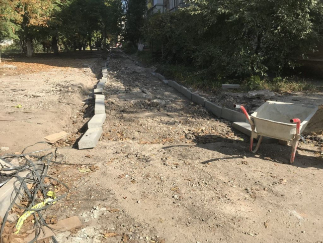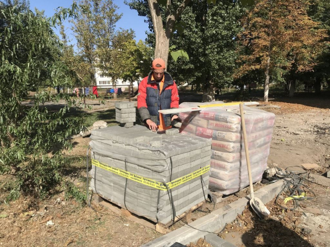 «В данный момент подготавливаем площадку под укладку бордюров, дальше идет подсыпка, сверху будем укладывать тротуарную плитку. Через 8-10 рабочих дней все будет готово. Иногда сдать вовремя объект мешают погодные условия или, например, грунт твердый, где-то корни, где-то старый советский бетон. Люки нужно тоже выставить на нужную высоту. Это всё занимает немало времени. Длина всей площадки 149 метров, ширина 3 метра. Еще сделаем маленькие тротуары к бельевым веревкам и к детской площадке», – рассказал рабочий по укладке тротуарной плитки Вадим Бабий.