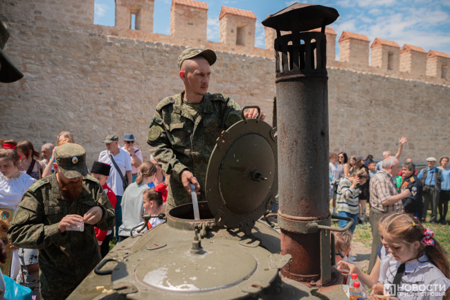 Гостей фестиваля не оставили голодными. Казаки щедро накормили посетителей крепости традиционными казачьими блюдами. Солдатская каша, чай, хлеб – основа рациона любого казака. Кулеш – так называется каша казаков, которую принято варить в большом котле. Для её приготовления нужно всего лишь пшено, сало, лук и морковь.