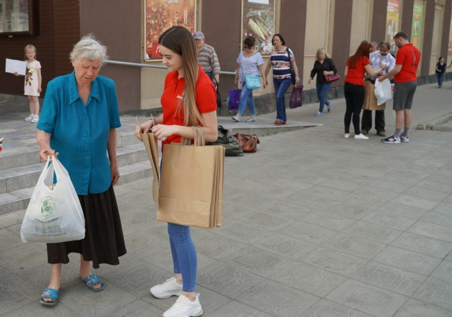 Организаторы предлагали жителям и гостям столицы переложить свои продукты и вещи из полиэтиленовых в бумажные пакеты