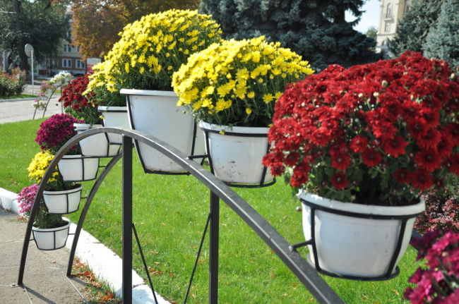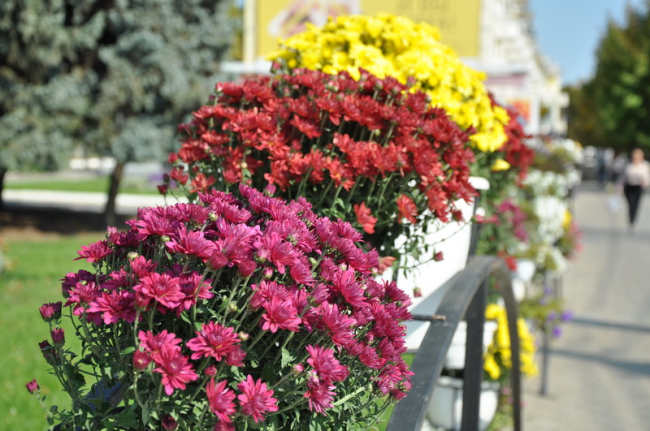 Также в центре Тирасполя в арочных вазонных конструкциях отцветшие петуньи заменяют многолетними хризантемами жёлтых и бордово-красных оттенков. Эти цветы способны пережить заморозки до -5 °С.