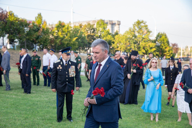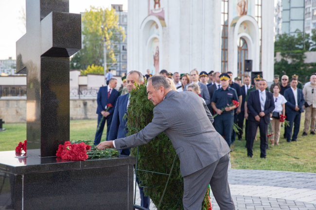 На Военно-историческом мемориале в Бендерах Президент ПМР Вадим Красносельский и посол России Олег Васнецов возложили цветы к поклонному кресту русским воинам