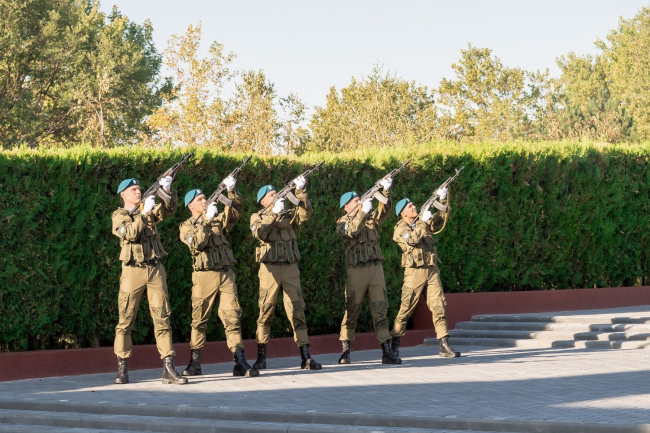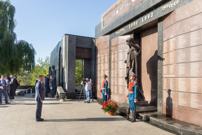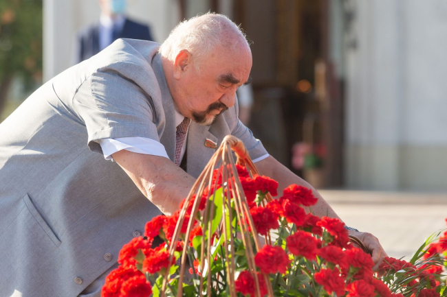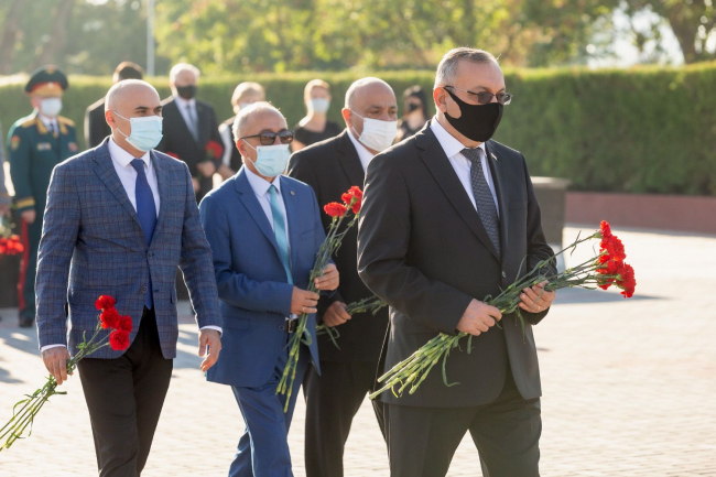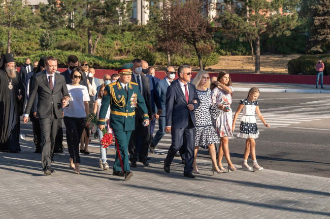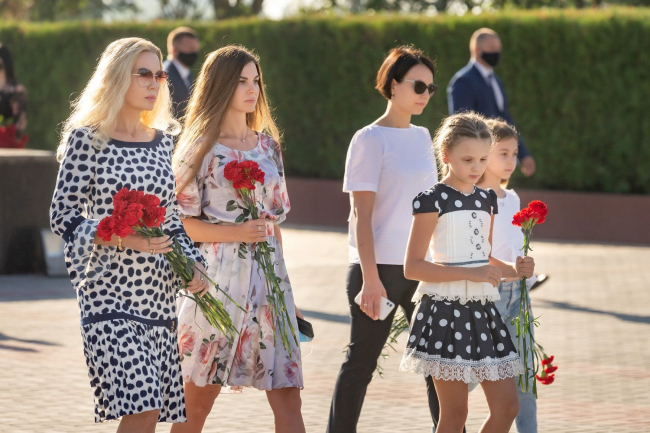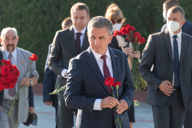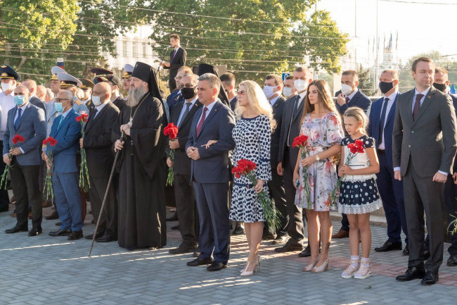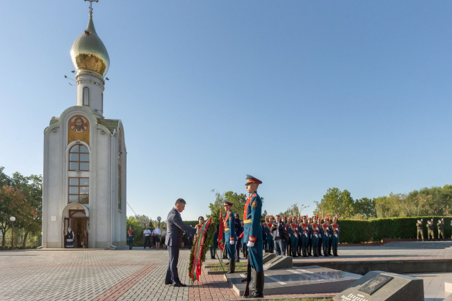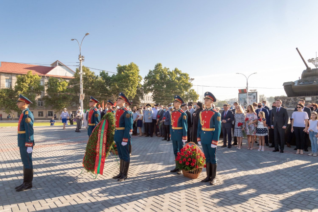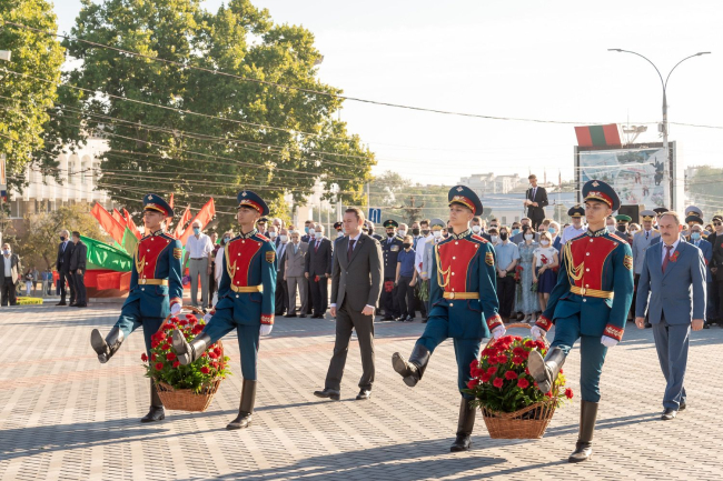 Официальные торжества начались в 8 часов утра на тираспольском Мемориале Славы. Руководство страны и города, духовенство, зарубежные гости собрались у легендарного танка Т-34. Они почтили минутой молчания всех, кто в разное время и в ходе различных войн и конфликтов отдал жизнь, защищая Приднестровье. Президент ПМР Вадим Красносельский от имени всего приднестровского народа возложил венок к Вечному огню. Россыпь цветов, как символ неувядающей памяти, оживила сегодня каменные плиты могил защитников и подножия памятников, составляющих мемориальный комплекс Тирасполя, – Защитнику ПМР, Воину-афганцу, чернобыльцам и Скорбящей Матери.