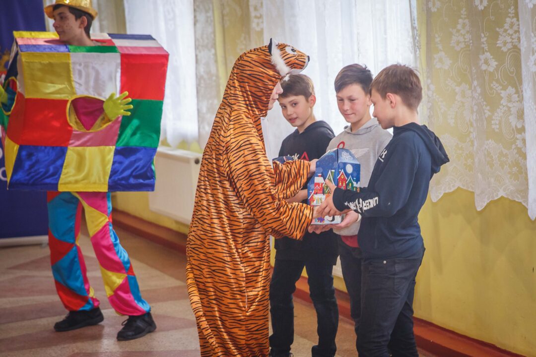 По традиции в гости к ребятам пришли Дед Мороз, Снегурочка и символ нового года – Тигр. Дети пели, танцевали, участвовали в веселых конкурсах и водили хороводы. Завершился праздничный вечер сладкими подарками.