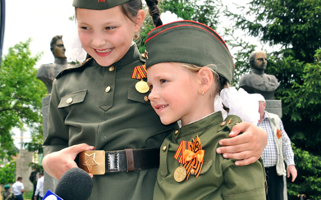 Впереди колонны горожане несли 20-метровую георгиевскую ленту