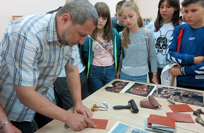 Помимо выставки, там прошёл мастер класс «Линогравюра», который провёл член Союза художников ПМР Олег Болтнев.