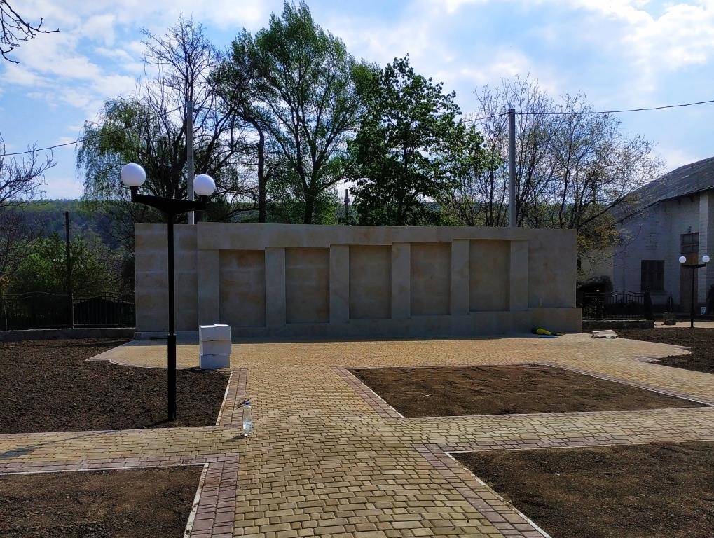 Основной объём работ уже выполнен. Возведена стена под будущую стелу, обустроена прилегающая территория: разбиты клумбы, выложены плиткой дорожки, установлены скамейки, фонари.