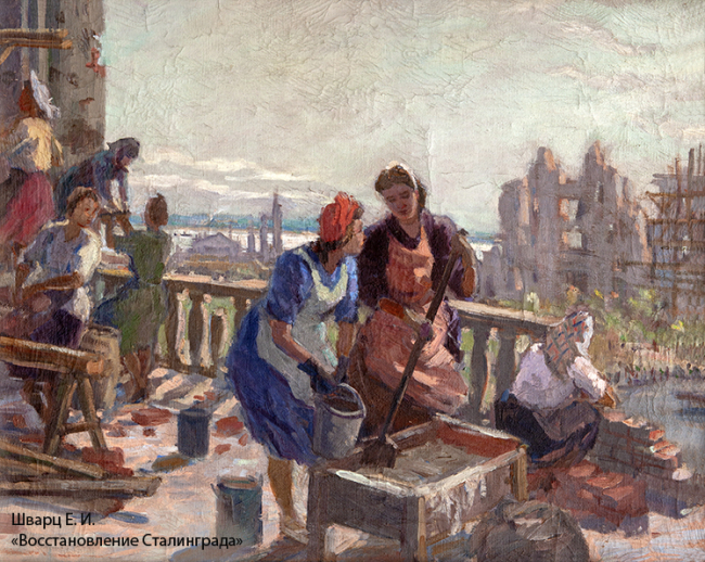 Экспозиция включает 25 копий полотен из фондов Государственного художественного музея, посвящённых Великой Победе