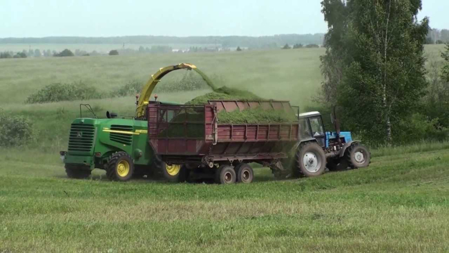 Двумя автомобилями измельченная масса доставляется к месту закладки. После хорошей трамбовки сенаж будет храниться до осени. С первого укоса заложено уже около 400 т.