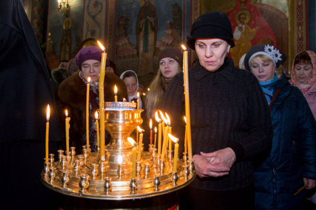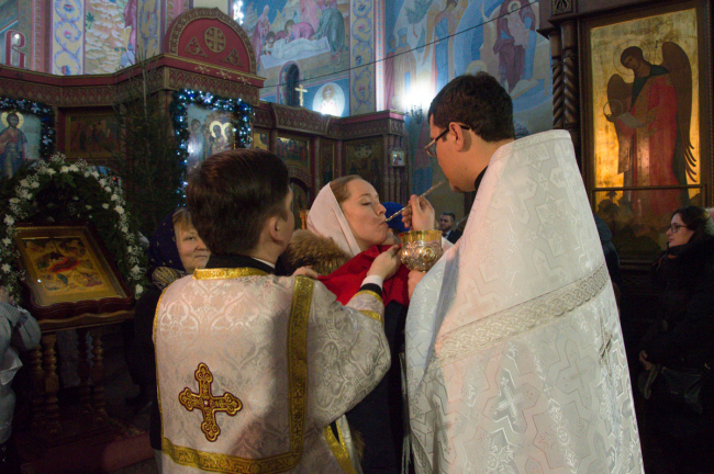 Праздничная служба традиционно длилась три часа и состояла из трёх частей: «Великого Повечерия», «Утрени» и «Первого Часа».
