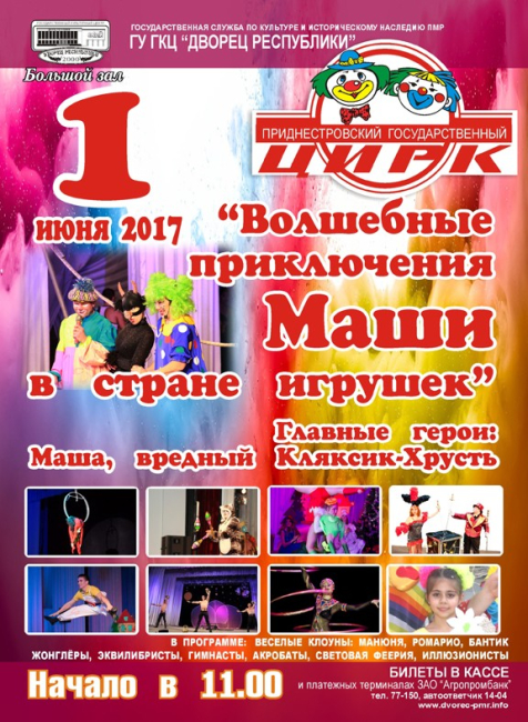 Тирасполь, 24 мая. /Новости Приднестровья/. 1 июня в большом зале Дворца республики Приднестровский государственный цирк даст представление под названием «Волшебные приключения Маши в стране игрушек». Оно будет приурочено к Международному дню защиты детей.