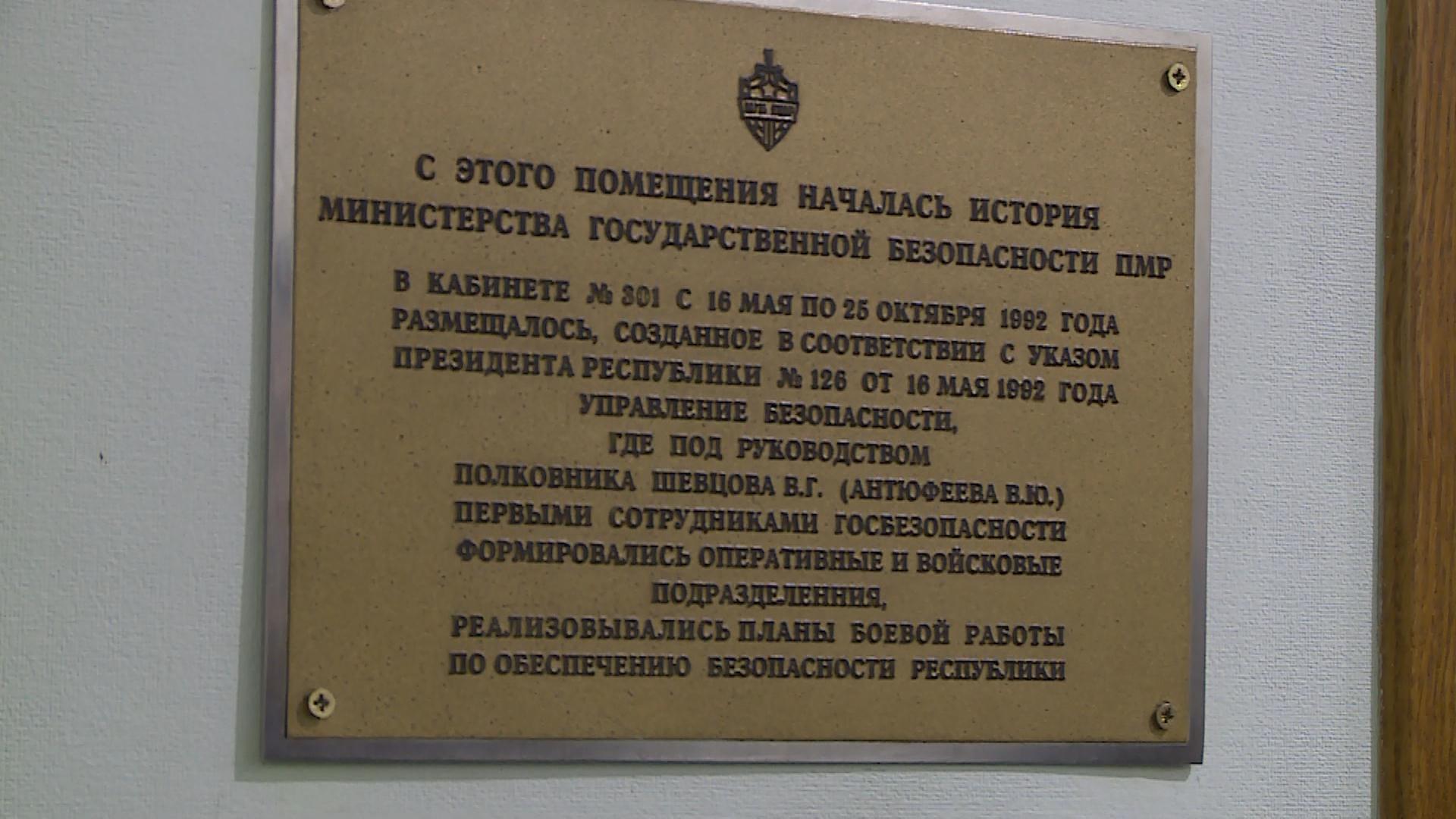 Тирасполь, 24 ноября. /Новости Приднестровья/. В здании Министерства госбезопасности ПМР восстановили памятную доску у кабинета, с которого в 1992 году началась история приднестровской спецслужбы. В мероприятии приняли участие министр госбезопасности генерал-майор Валерий Гебос, его заместитель полковник Эмиль Мартынов, а также сотрудники ведомства.