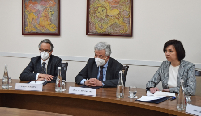 Тирасполь, 24 мая. /Новости Приднестровья/. Глава внешнеполитического ведомства Виталий Игнатьев встретился со Специальным представителем Действующего председателя ОБСЕ Томасом Майер-Хартингом. Во встрече также приняли участие Чрезвычайный и полномочный посол Королевства Швеция в РМ Анна Либерг и глава Миссии ОБСЕ в Молдове Клаус Нойкирх, с приднестровской стороны – председатель Совещательного собрания первых приднестровских депутатов, Первый Президент ПМР Игорь Смирнов, сопредседатель Общеприднестровского народного форума, президент Союза промышленников, аграриев и предпринимателей Приднестровья Юрий Чебан и руководитель Общественной палаты ПМР Владимир Ладункин.