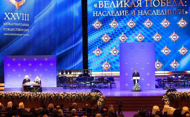 На торжественной церемонии открытия чтений в Государственном Кремлевском Дворце было зачитано приветствие главы Совета Федерации Валентины Матвиенко.