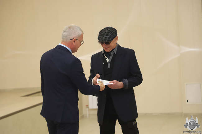 Руководитель МВД вручил нагрудные знаки «За содействие Министерству внутренних дел» режиссёру Юрию Музыке и Заслуженной артистке МССР Людмиле Байрактаровой.