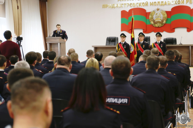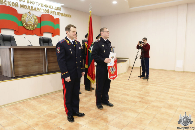 Среди территориальных подразделений МВД ПМР по итогам работы прошлого года образцовым стало Управление внутренних дел г. Тирасполь. Начальнику столичной милиции Сергею Кирману Руслан Мова вручил переходящее знамя.