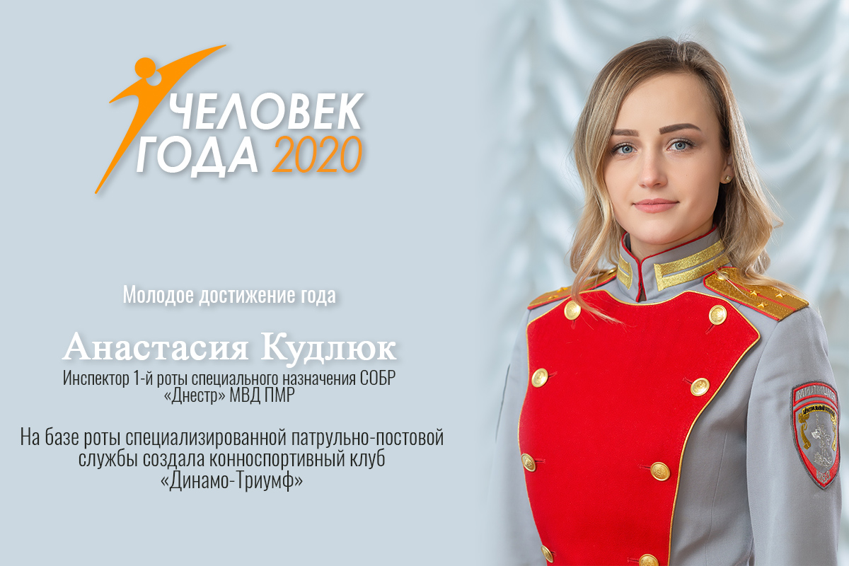 Тирасполь, 28 февраля. /Новости Приднестровья/. Заслуженную награду в номинации «Молодое достижение года» получила инспектор 1-й роты специального назначения СОБР «Днестр» МВД ПМР, старший тренер конно-спортивного клуба «Динамо-Триумф» Анастасия Кудлюк.