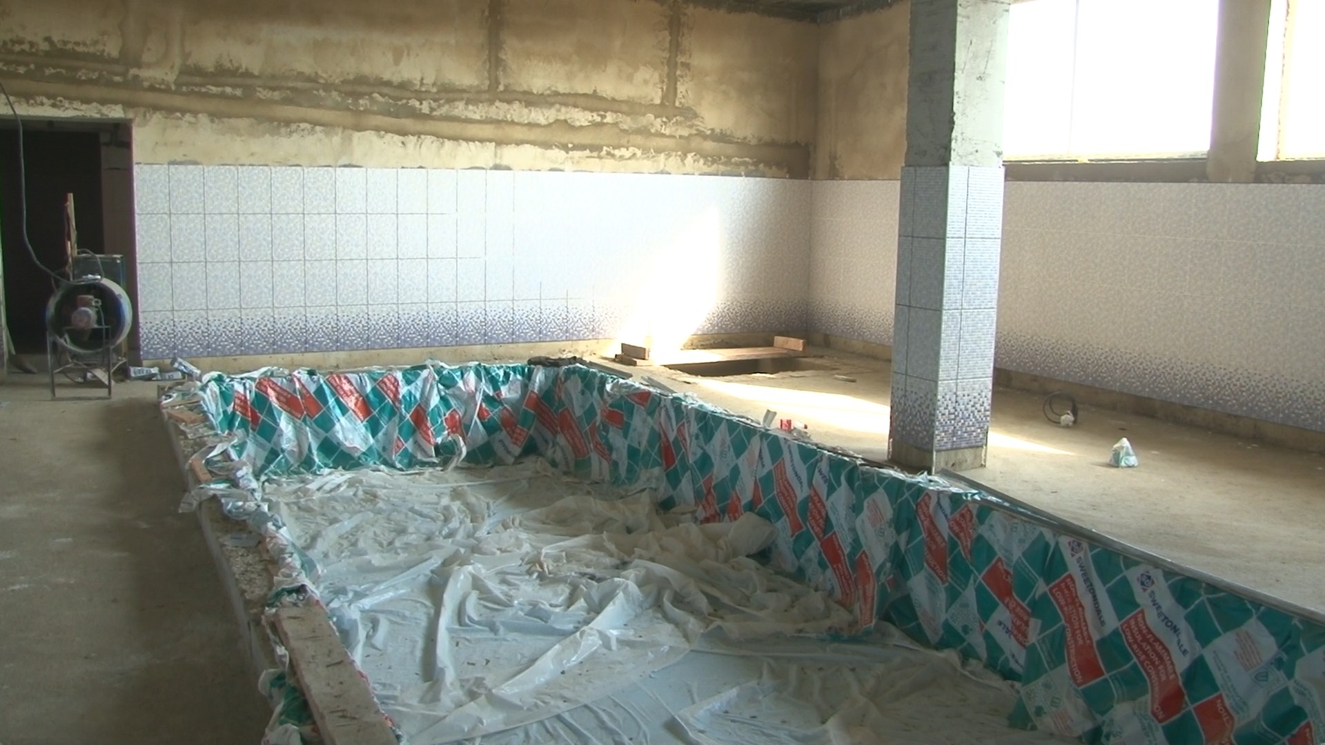 Внутри здания начаты отделочные работы. Уже проложены коммуникации, установлены окна и бассейн. В настоящее время штукатурят и шпаклюют стены, потолки, укладывают плитку.