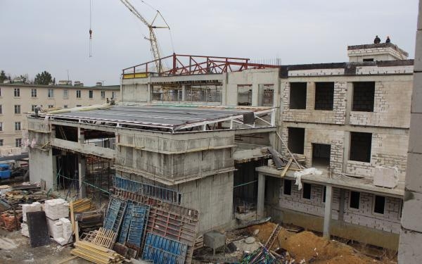 Также к настоящему времени выполнен монтаж почти 100 окон, что составляет примерно половину от их общего числа. Остальные будут установлены по окончании кладки наружных стен в спортивном и актовом залах, а также в 4-м и 5-м блоках здания. Все эти работы строители планируют завершить в течение месяца.