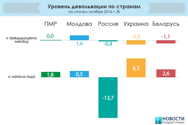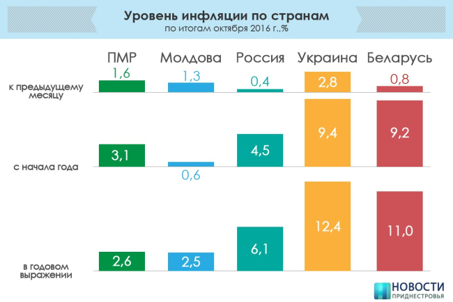 Так, в Украине инфляция достигла 2,8%, в Молдове — 1,3%. Под влиянием, в том числе и динамики стоимости товаров и услуг в сопредельных государствах, в Приднестровье цены выросли в среднем на 1,6%, что после июньского показателя является наибольшим месячным значением за последние четыре года.